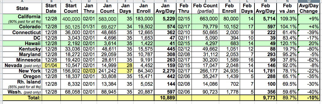 On the one hand, these numbers (if accurate) would mean that Minnesota is doing pretty lousy in February, enrolling people in private plans at only 38% the pace that they did in January. On the other hand, the numbers involved only lower the overall rate among the 13 states I have data for by 0.3%, so it's not too concerning: