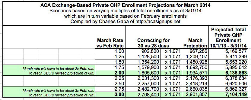 - Regarding March, I do have some very preliminary numbers from the first week of March for six states, and overall there's definitely an uptick so far, but it's far too early to have any idea how much of one. The bottom line is that March (which will only count 30 days, since March 1st will be included on the February report) will have to hit around double the February enrollment rate in order to hit the revised CBO 6 Million number, and nearly triple the February rate in order to hit the original CBO 7 million number. Doubling the rate (around 64,000/day) would require a similar surge to what we saw in December. Tripling it would require outpacing December by 50%. Doable? Perhaps. Likely? Probably not, but who the hell knows?