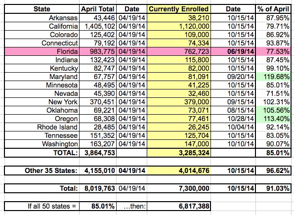 I still stand by this, but an extensive discussion with Jed Graham of Investors Business Daily made me realize that presenting it this way can lead to confusion, because I'm essentially mixing together two different estimated numbers (% paid & attrition rate), each of which may vary widely from state to state, instead of simply comparing the number of people currently enrolled against the 8.02 million who had enrolled (whether paid up yet or not) as of April 19th.