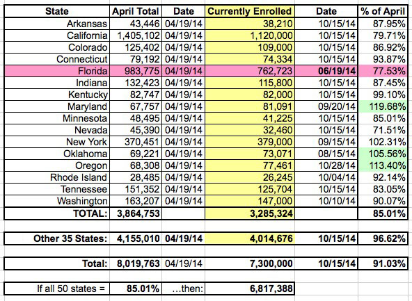 I also noted that there are two problems with the Florida data: First, that it's had significantly more dropoff (22.5%) from the official April figure than any of the other states listed (with the exception of Nevada, which has had its own technical headaches to the point that it's dropping its exchange entirely).