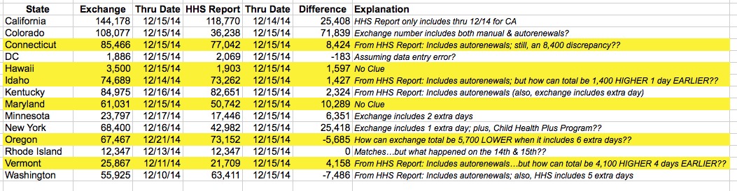 In other words, I think I've just cleared up the mystery in at least 8 states all in one shot. The enrollment number given by the state exchange as of 12/15 was higher than that given by HHS because the HHS number only ran through 12/13...2 days less. GROAN...