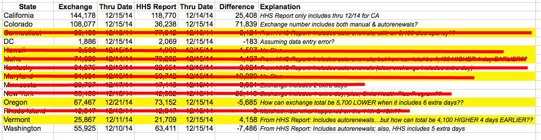 It got to be so strange that I actually whipped up a little spreadsheet for all of the state-based exchanges (minus Massachusetts, which is a special case anyway; plus Oregon, which is running off of HC.gov this year but has a large discrepancy from the official State of Oregon Website which is reporting enrollments this year as well). The yellow lines are the states I'm most concerned about (the others all have either obvious explanations or are minor enough not to worry about). Afterwards I'll run through the problems with each one.