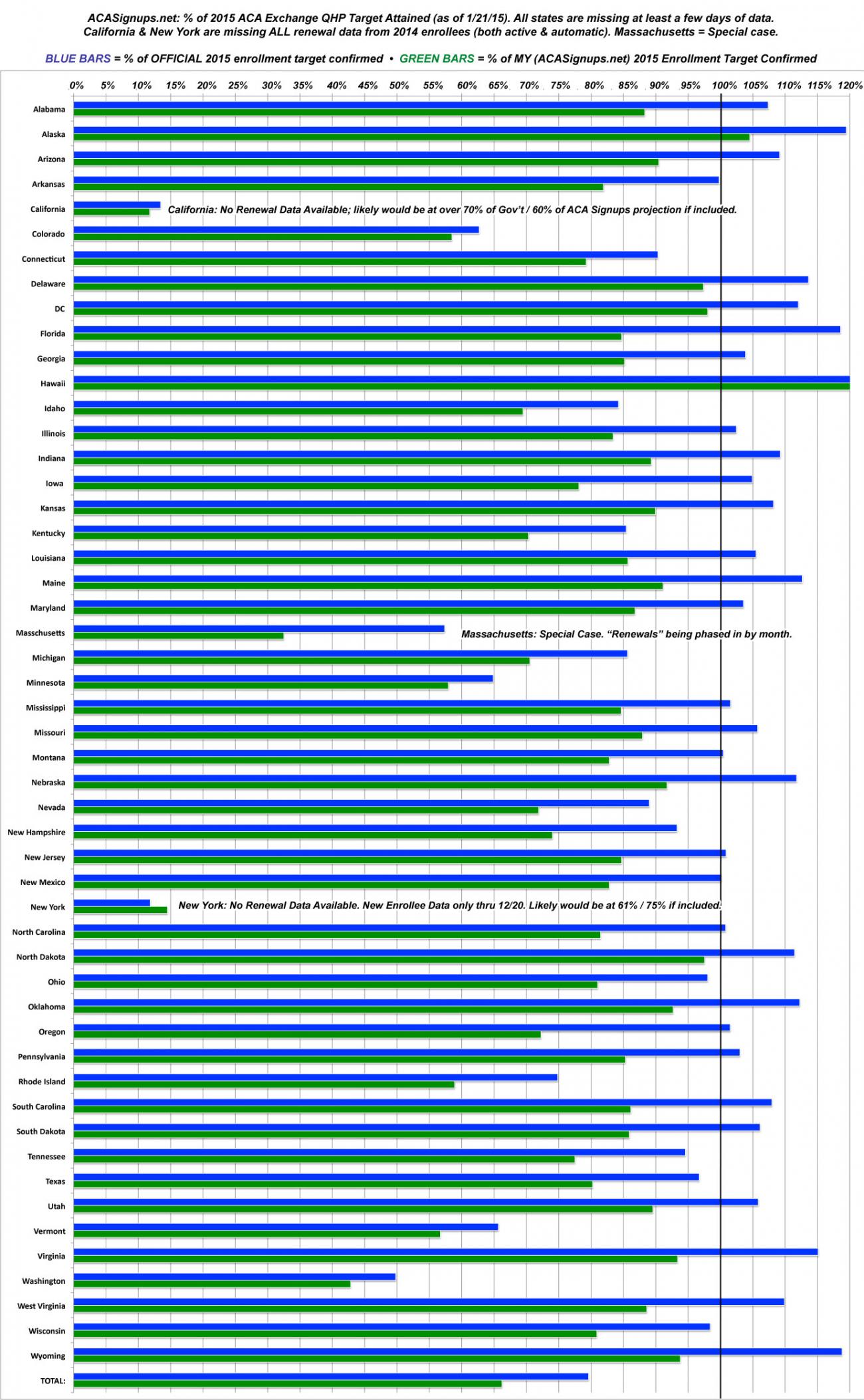 - At least 33 states have now reached the "official" 2015 QHP enrollment target laid out for them by either the HHS Dept (10.4 million nationally) or, in some cases, individual state governments/exchanges. Again, this means roughly 30% more enrollees than the April 19, 2014 total, but in some cases it's higher or lower (for instance, Florida only targeted enrolling about 9% more people this year than last, while New York is hoping to nearly double their 2014 total...and Massachusetts is a whole different game).