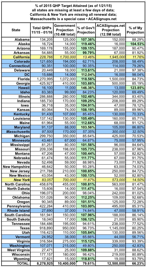 - Add 'em all up and there are now 8.28 million confirmed QHP selections for 2015 nationally. As of today, I'm pretty sure the actual number is closer to 9.7 million (1.3 million NY/CA renewals, plus another 120K or so scattered amongst all of the states).