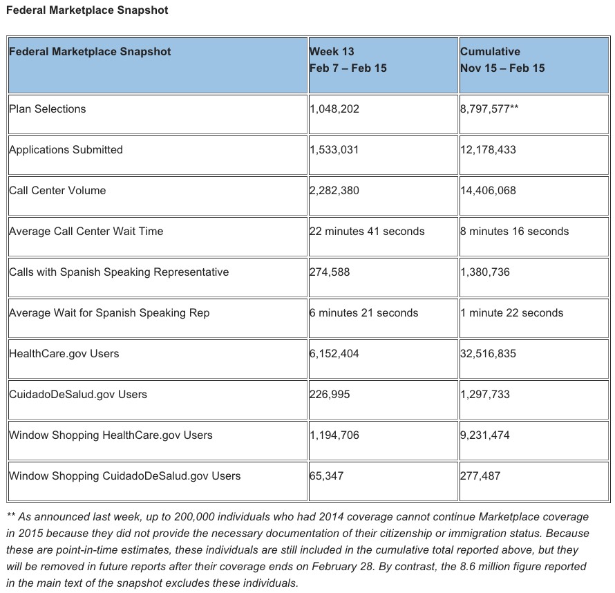** As announced last week, up to 200,000 individuals who had 2014 coverage cannot continue Marketplace coverage in 2015 because they did not provide the necessary documentation of their citizenship or immigration status. Because these are point-in-time estimates, these individuals are still included in the cumulative total reported above, but they will be removed in future reports after their coverage ends on February 28. By contrast, the 8.6 million figure reported in the main text of the snapshot excludes these individuals.
