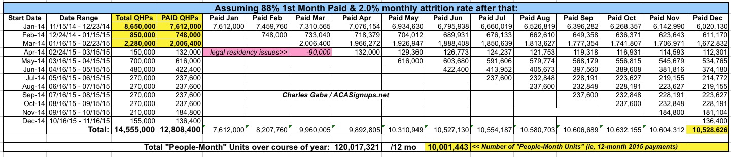 As you can see, assuming that I'm reasonably close with these estimates, the number of people actually paid and effectuated as of any given date throughout the year should have started at around 7.6 million on January 1st and hit around 10 million even on March 1st. It should hover at around 10M for April, then jump up to around 10.6 million by June as the wave of tax season enrollees kick into effect.