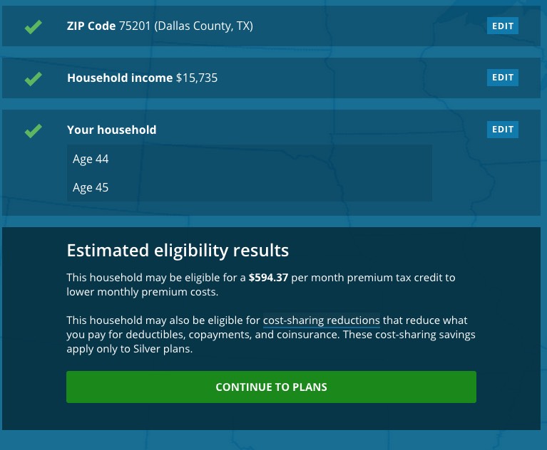 Oh, crap! This couple expects their household income to be literally at the very upper edge of the FPL. Since 100% FPL doesn't qualify adults w/no kids for Medicaid, and Texas hasn't expanded it, they're left out in the cold, with NO healthcare coverage options whatsoever.