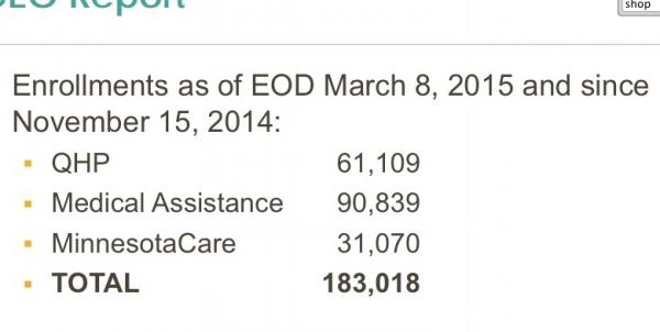 Minnesota reported 59,704 QHP selections as of 2/21/15. As of March 8th they're reporting 61,109 (the text above reads 3/12 but the actual dashboard report makes it clear that the actual data was through 3/08):