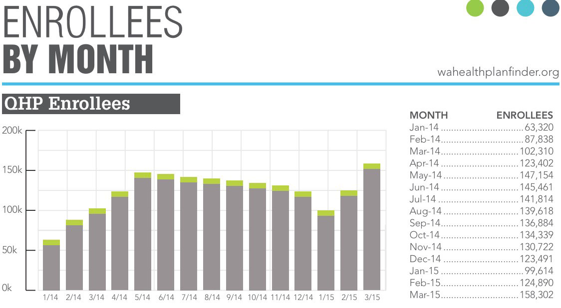 This also suggests that, depending on how WA is counting things, the off-season rate has actually been higher than 147/day. That is, assuming the 165,436 figure is the number of currently paid enrollees, that means there have actually been 7,134 QHP additions since 3/09 (445/day) instead of 4,704 since 2/21 (147/day). However, in the interest of caution I'm going to assume the lower figure for now.