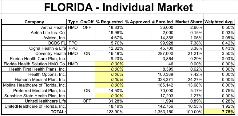 Anyway, assuming I have all my numbers straight here, it looks like Florida, with the 2nd largest individual policy market in the country and the largest ACA exchange enrollment in the country, is probably looking at around a 12.4% weighted average increase (or at the very worst, 16.8%).