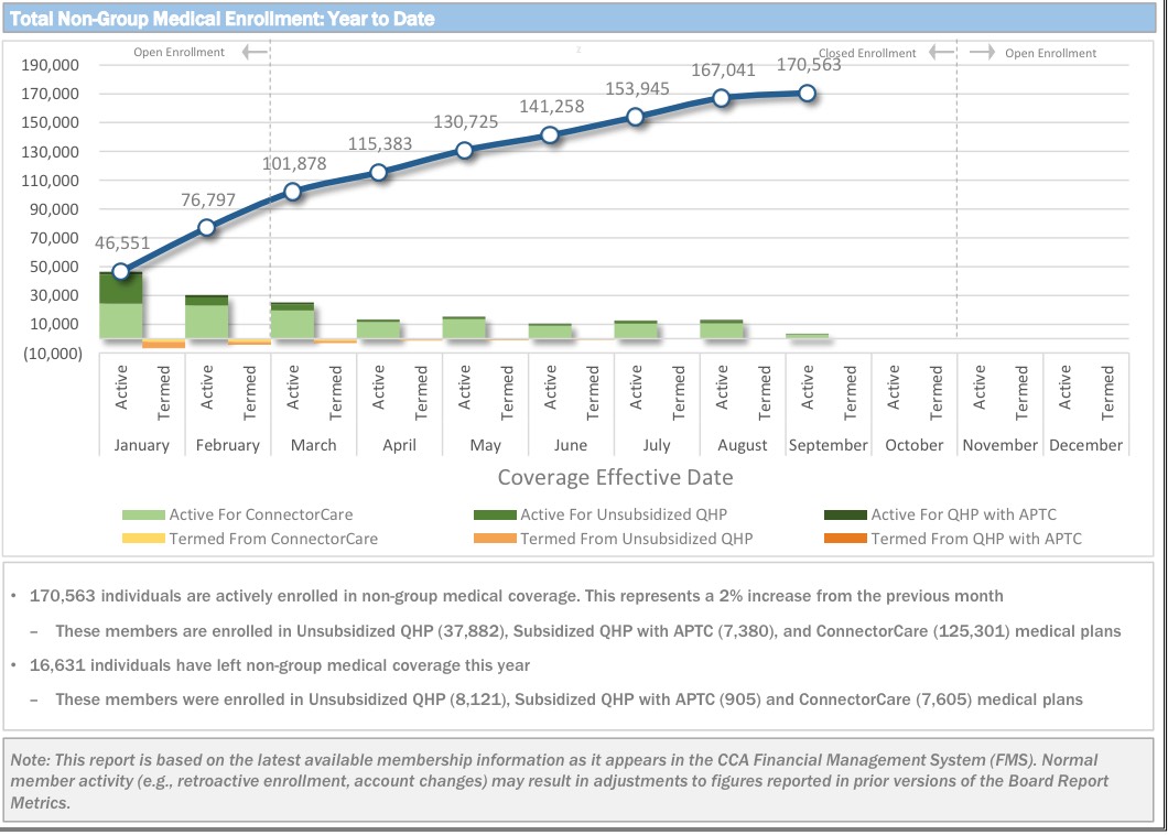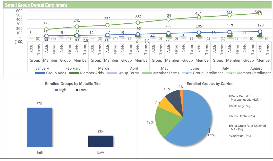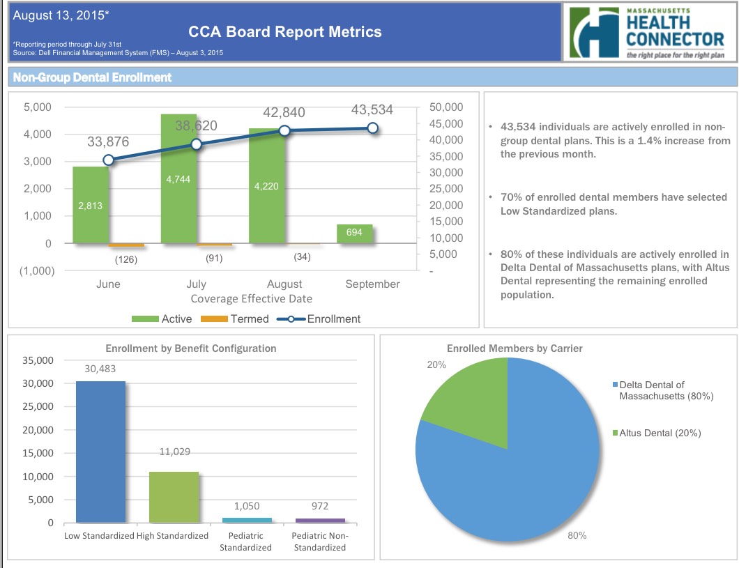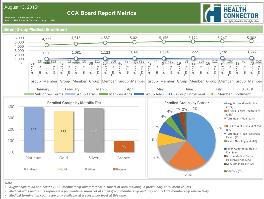 But wait, there's more! Look below and you'll see a whole mess of pie charts, bar charts and line charts, breaking out everything from Metal Level selections and Market Share by Provider to SHOP enrollments (5,302 lives covered as of August 1st) and even Dental Plans!