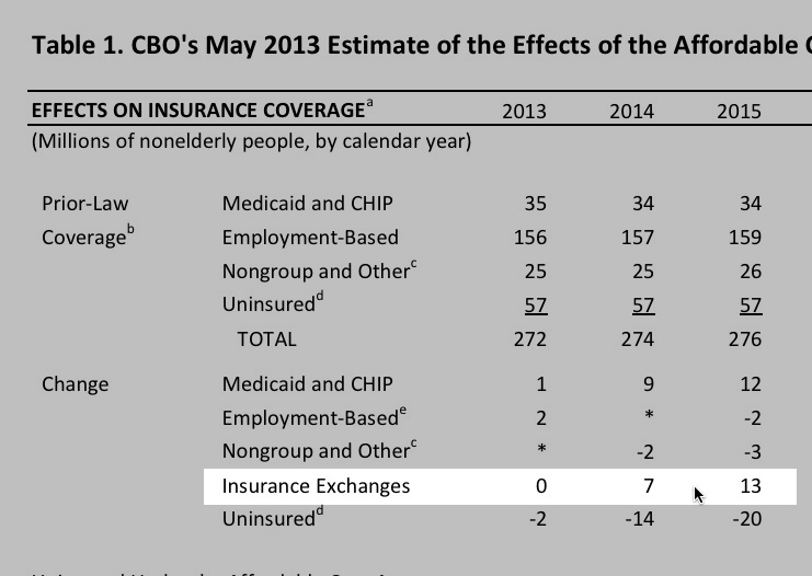 Of course, the CBO claimed that the uninsured rate for those under 65 started out at 20% instead of 15.3%. Obviously they used a different methodology to come up with that, and they round everything off to the nearest percent point anyway, but even if you use that as your starting point, a 21.6% drop would bring it down to 15.7%, still impressive.