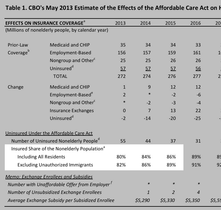 The very same CBO report also projected that the total uninsured rate including undocumented immigrants would be down to 14% by this year, and down to 11% if you exclude that group.