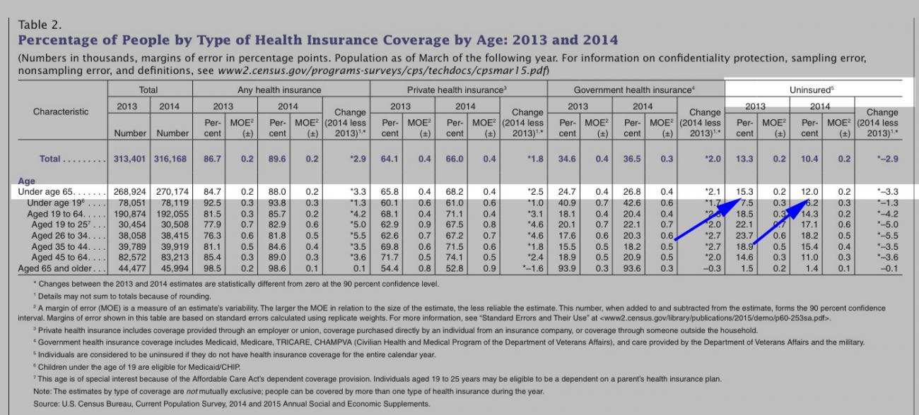 There you go...for the under 65 population only, the total uninsured rate for the full calendar year dropped from 15.3% in 2013 to just 12.0% in 2014, or a 21.6% drop.