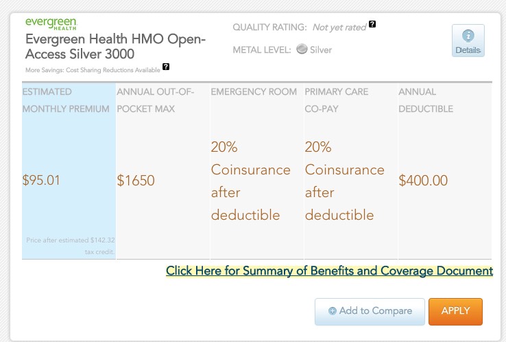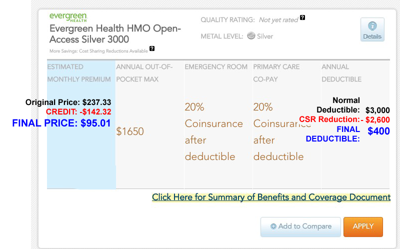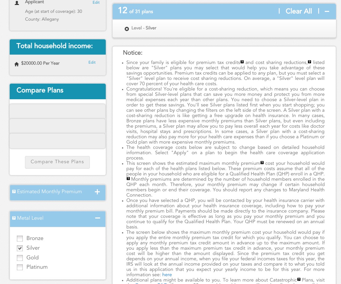 I've poked around the MD exchange, and have some praise as well as one complaint about how the site is set up (note that I'm not sure how many of these features are changed from last year). Most of the praise has to do with cost sharing reductions, which are only available for silver plans (for those under 250% of the Federal Poverty Line). Most people know about the APTC (Advance Premium Tax Credits) which lower the monthly premiums for those under 400% FPL, but very few know anything about CSR assistance, which cuts deductibles, co-pays and co-insurance down to size for those under 250% FPL.