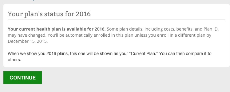 Aside from the fact that some people may not even know whether or not their current plan is "through" the ACA healthcare exchange or not ("Marketplace" is a pretty generic term, after all...) the problem is that if you choose "Yes", here's what pops up: