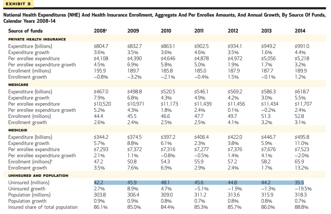 • Second: Roy claims that "last week" CMS estimated that "the number of uninsured fell by 12.6 million from 2010 to 2014". He fails to provide a link to the CMS report from which he got that 12.6 million figure. I don't recall seeing this number last week, do you? I'm not saying he's wrong; in fact, I suspect he's correct. The closest I have is this CBO estimate of 12 million fewer uninsured in 2014. The point here is that he didn't provide a link to his source for a very specific, key data point. Perhaps it was just an oversight.