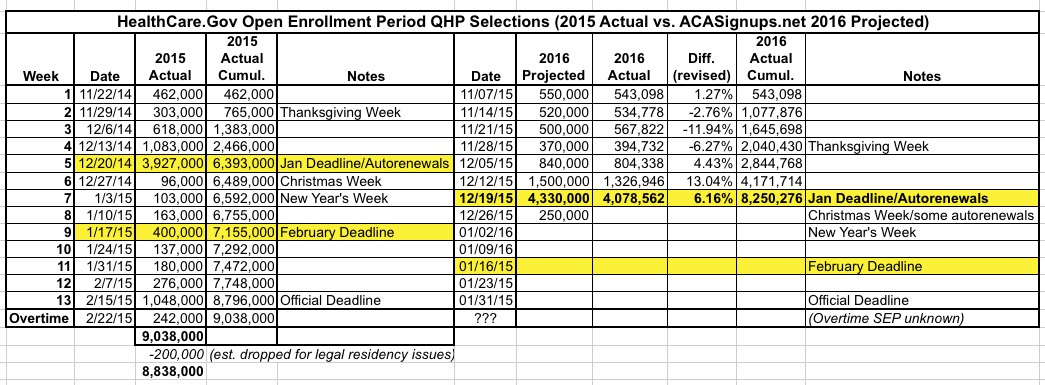 In addition, while these won't impact the federal exchange numbers, several state-based exchanges (Maryland, Massachusetts, Minnesota, New York, Rhode Island and Washington State) have/had January deadlines later than the 12/17 one on the federal exchange and some other states, so there's a lot of bumpy numbers going into Week Eight.