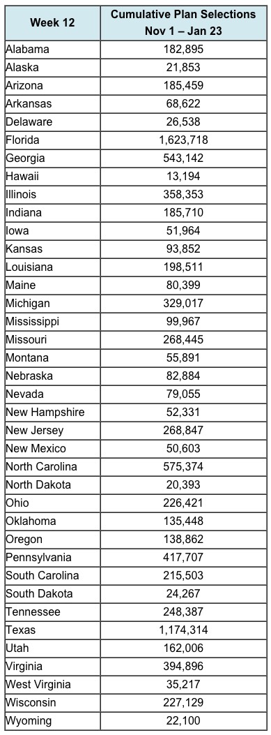 Overall, net plan selections for Week 12 totaled 103,172. Over the same time period, net new plan selections totaled 144,971. Net new plan selections take into account new plan selections in the reporting week minus any consumer or insurer-initiated cancelations for new plan selections. As a reminder, this year the number of net plan selections accounts for both insurer and consumer-initiated cancellations that occur before the end of Open Enrollment. This is a change from last year, and it will result in a larger number of cancellations being accounted for during, rather than after, Open Enrollment. Last year, cancellations from insurers that happened during Open Enrollment were reflected only in reports on effectuated enrollment after the end of Open Enrollment. There will likely be a smaller difference this year between plan selection totals at the end of Open Enrollment and subsequent effectuated enrollment.