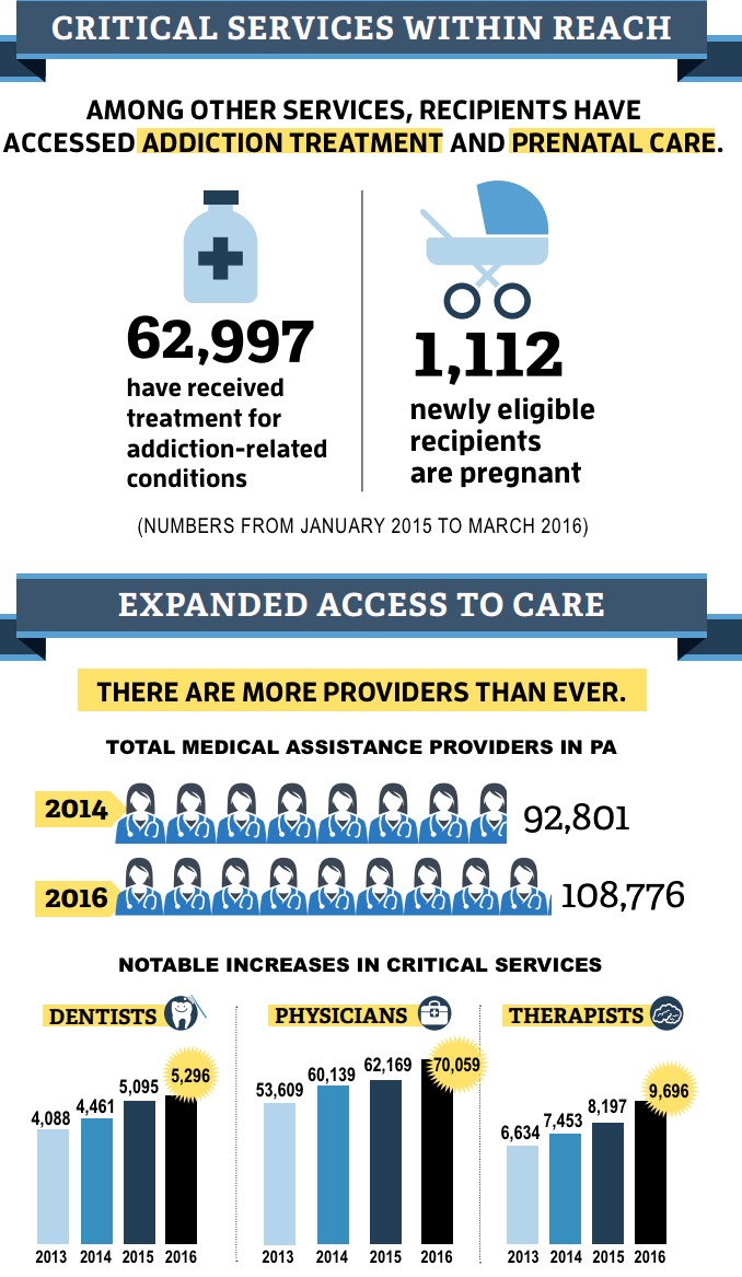As of April 2016, the expansion had reached 625,970 newly eligible Pennsylvanians, ages 18 to 64.