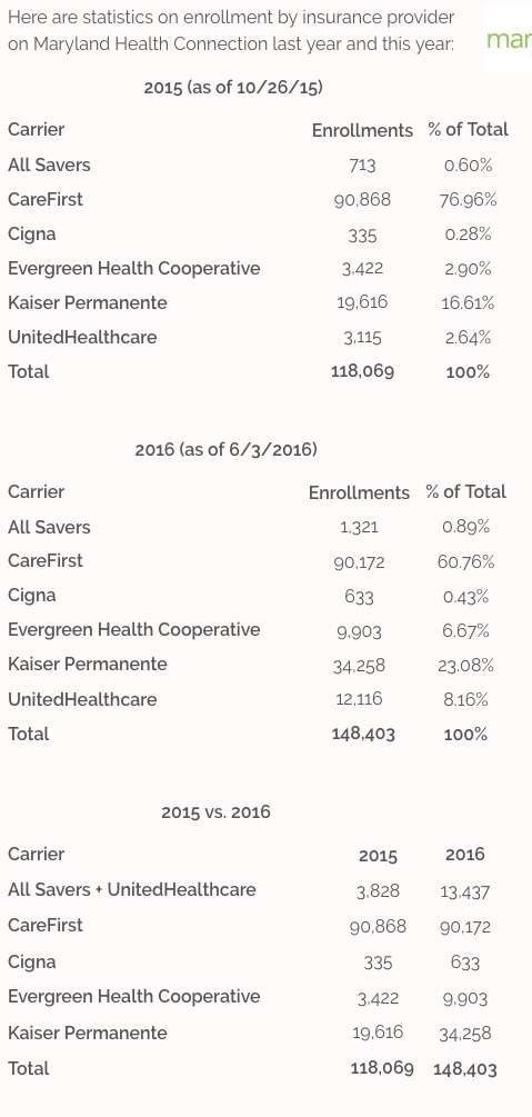 However, they just posted the following market share breakdown, which shows that they currently have 148,403 Marylanders enrolled in exchange policies, a net drop of just 8.5%. Apparently they've added more people during the off season via SEPs than they've lost due to attrition since April.