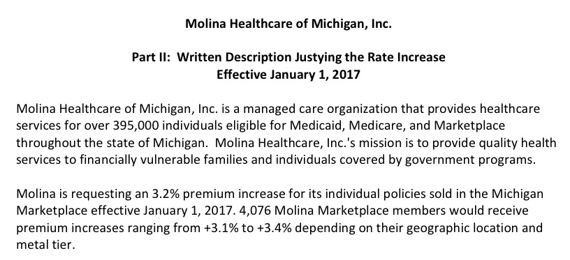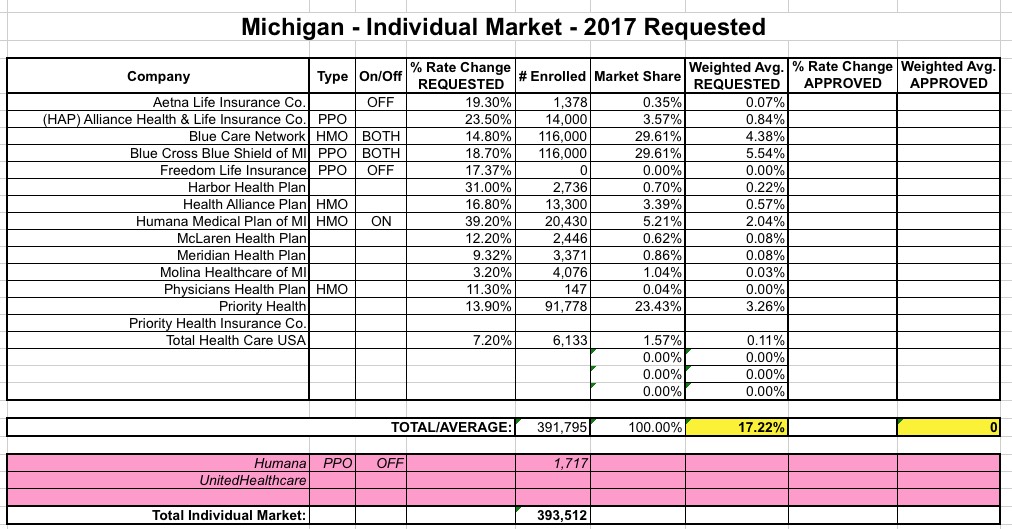 My home state of Michigan has finally published the "Part II - Consumer Justification Narrative" carrier filings for 14 of the 15 carriers offering individual market plans next year. The combined total number of current enrollees comes in at around 390,000 including both on and off-exchange numbers. Last year, Michigan had 560,000 people on the ACA-compliant individual market, so it's important to note that there's likely at least 170,000 people missing from this analysis. However, many of these are likely found here: