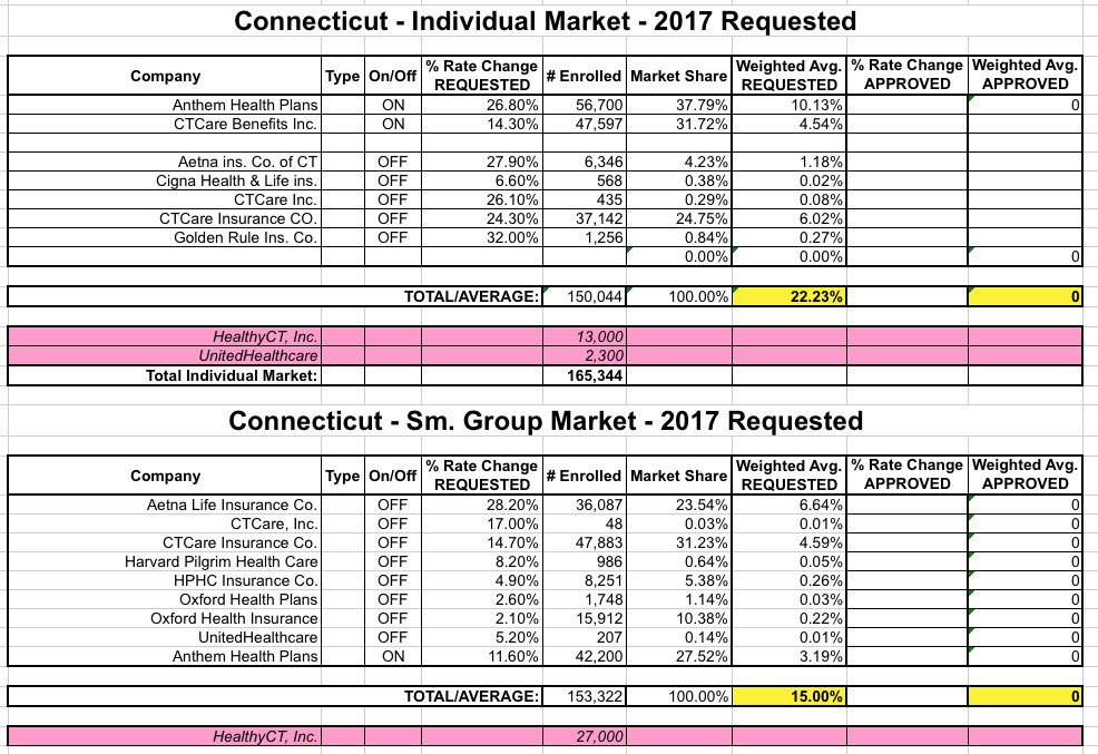 Thanks to commenter "Junaed S" who directed me towards this simple, cut 'n dry PDF from the Connecticut Dept. of Insurance detailing the requested rate hikes for the CT individual and small group markets for 2017:
