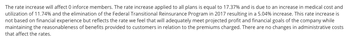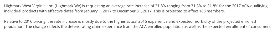So...the most likely scenario to me seems to be that a few of those carriers are either replacing certain plans or dropping them entirely, while keeping others with a smaller number of current enrollees. For instance, in 2014, Highmark BCBS had a whopping 31,000 enrollees...yet for 2017 their rate hikes "only affect 188 people"??