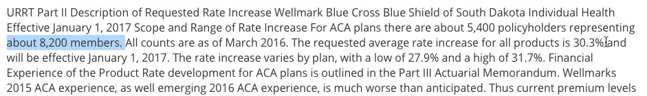 Only 4 carriers appear to be participating in the ACA-compliant individual market in South Dakota next year: Aetna, Sanfrod, SD State Medical and Welmark. I only have the enrollment numbers for 3 of the 4, but the requested rate hike for the fourth one (Sanford) is pretty close to the average of the other three anyway, so it shouldn't really impact the overall average by much: