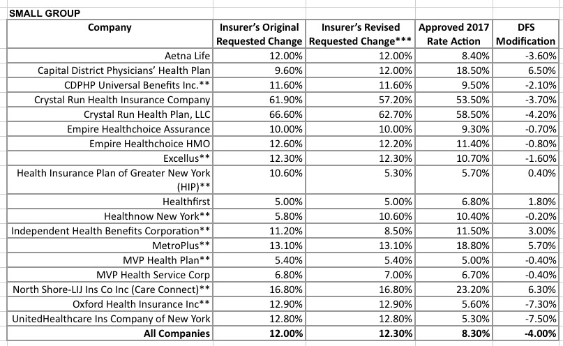 More than one million New Yorkers are enrolled in small group plans. Insurers requested an average rate increase of 12.3 percent in the small group market. DFS cut the requested rate increases by 32 percent to 8.3 percent in 2017, saving small businesses $251 million. A number of small businesses will also be eligible for tax credits that may lower those premium costs even further.