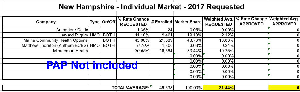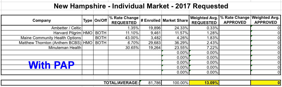 Finally, there's a third twist: Like Arkansas, New Hampshire's ACA Medicaid expansion program was converted into a "Private Option" program (Premium Assistance Program, or PAP). These are essentially the same QHPs that non-Medicaid recipients are enrolled in, but the premiums are paid for using Medicaid money. I think they're included in the same risk pool as the "normal" QHPs, but I'm not 100% certain about this. As you can see below, this makes a massive difference, since the two carriers requesting the lowest rate hikes (Ambetter/Celtic and Anthem/Matthew Thornton) also happen to have the largest percentage of PAP enrollees. Including or not including PAP numbers makes the difference between a 13.1% weighted average and 31.4%.