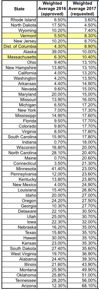 Anyway, if you have time, and can bring your excellent talents to this angle, it might help prompt others to think more on it, and perhaps a better solution will evolve over time. Vermont, DC, and Mass I think are the states with merged pools, and they have relatively low increase requests per your tables. It would be interesting to compare their history over the prior years. One would assume the group rates went up more, since the individual rates went up less. But at least the pain is spread over more people. IMHO, it should be spread over everyone, not just some particular group being singled out.