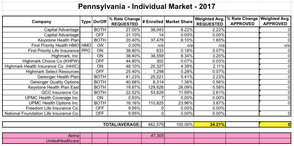 OK. Last week I wrote up a post speculating about the potential impact to the state- and national-level average rate hike requests of Aetna dropping out of the ACA exchanges in 11 states. My conclusion was that the average will increase in some states...but may actually drop in others, since Aetna would otherwise have asked for rate hikes higher than the average requested by the other carriers in that state. Of course, this isn't really a positive development, since their current enrollees are still losing their plans entirely, and since a 50% hike from Aetna could still end up costing less than a 10% hike from one of the other carriers...but as always, this is the best I can do here.
