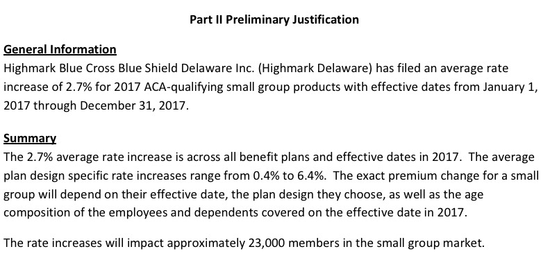 The Commissioner recommended approval of a 32.5 % average rate increase in the individual market for Highmark Blue Cross Blue Shield of Delaware. The approved average rate increase for the small group market for Highmark’s plans is 2.74%.