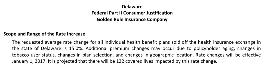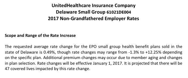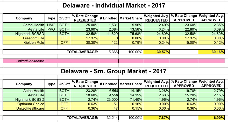 Delaware: Approved *unsubsidized* 2017 rate hikes: 30.2% (indy mkt), 6.9% (sm. group mkt)