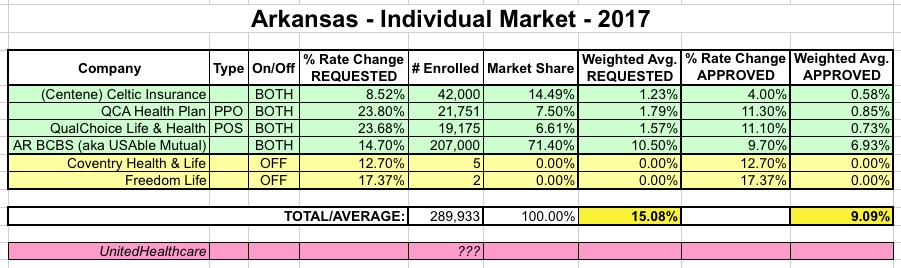 In mid-August, all of the carriers that offer plans in the Arkansas exchange proposed new rate increases for 2017, all of which were lower than their initially filed rates. Rate increases were then reduced even further for QualChoice and QCA: