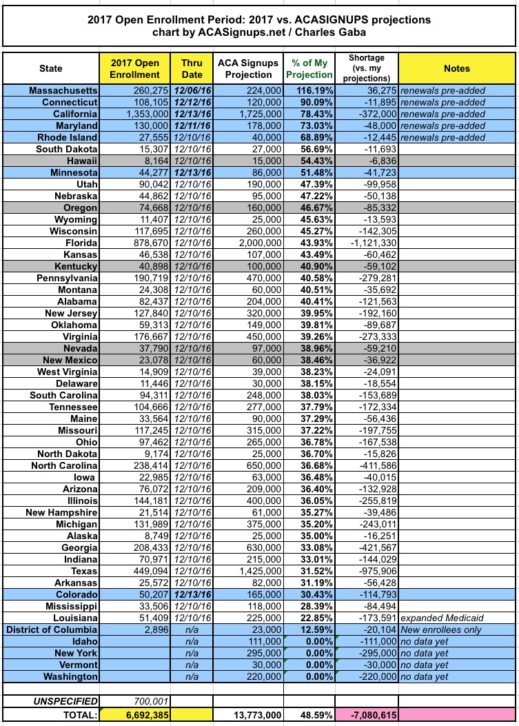 UPDATE: State by State: 14 states ahead of expectations, 10 states behind as of 12/10/16