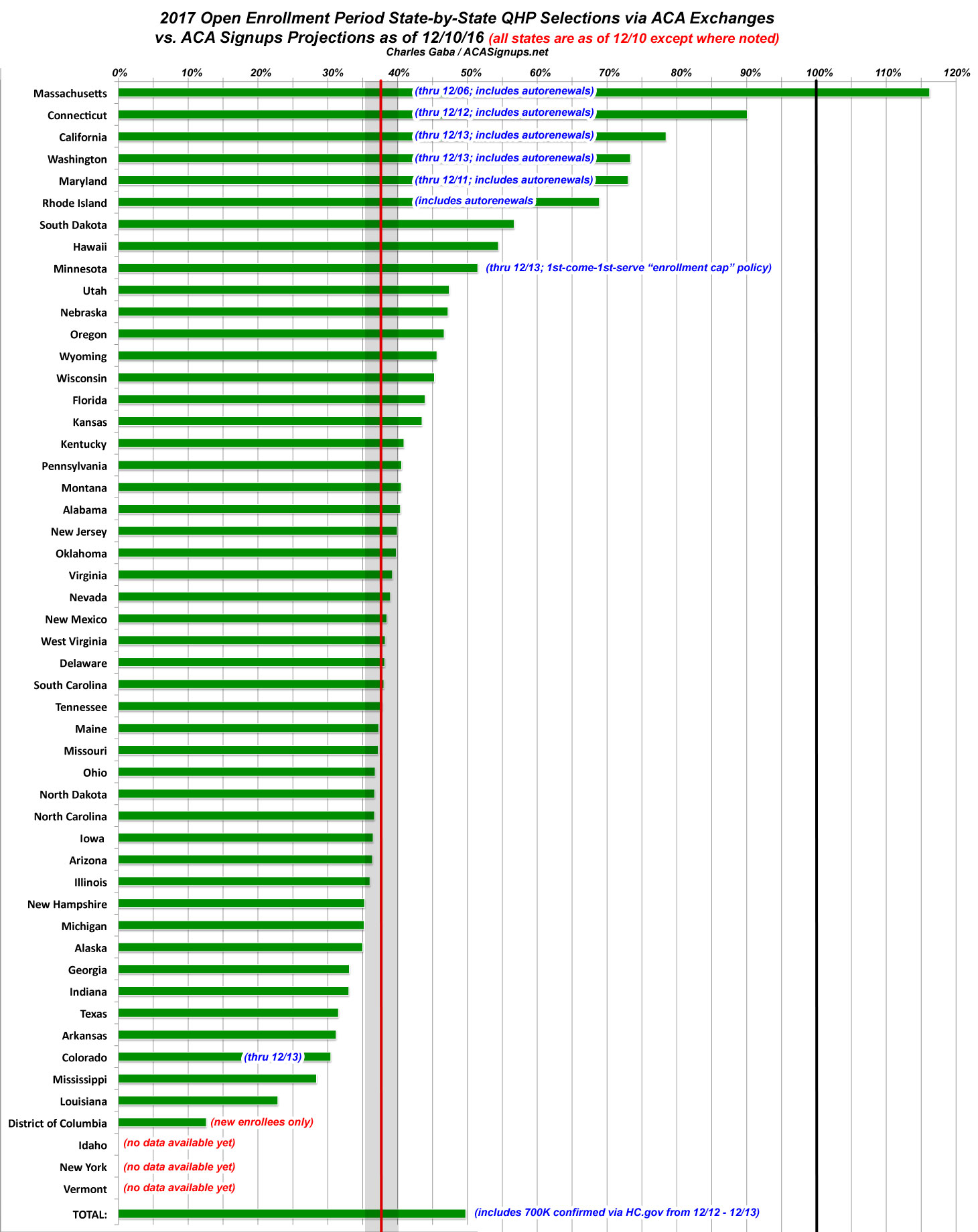 - Six states (MA, CT, CA, MD, RI & WA) can't really be counted as "ahead" because these states have already "pre-loaded" their automatic renewals of existing enrollees. These can't really be matched to the rest of the states until after December 19th, when all of the HC.gov auto-renewals should be added to 39 states.