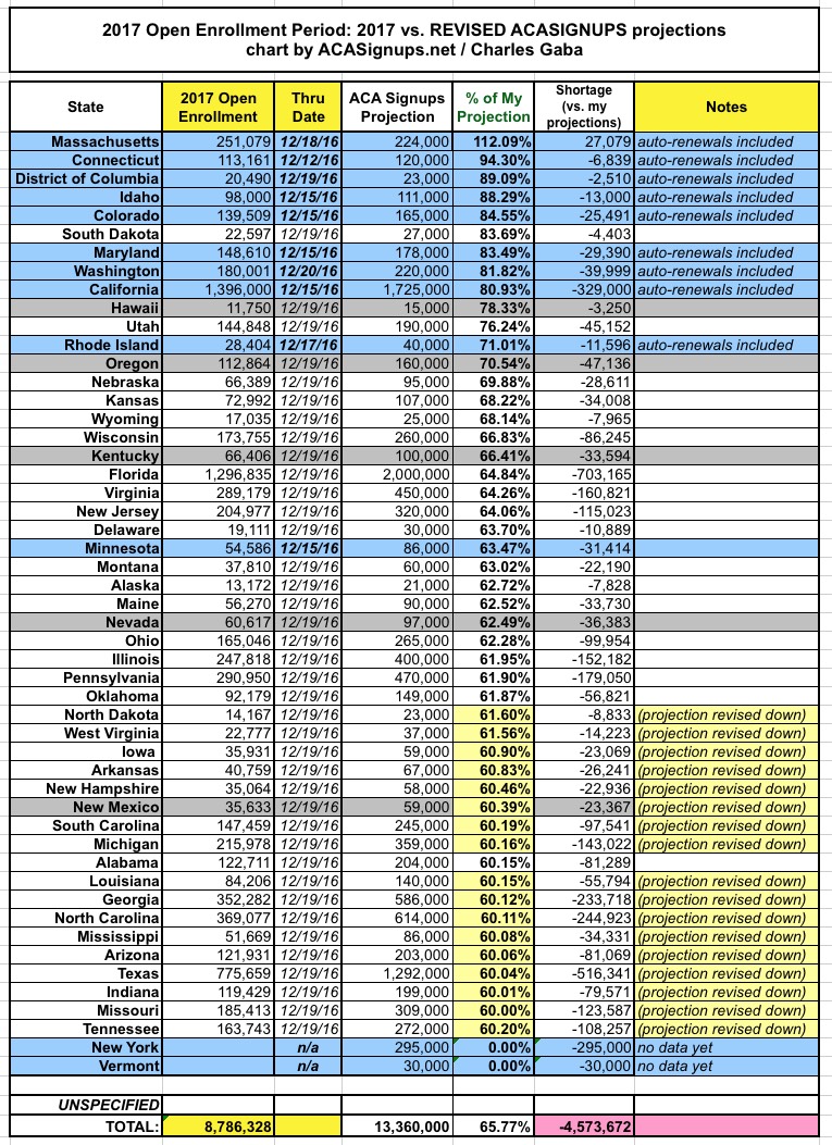 With that in mind, I've adjusted my projected totals to ensure that every state has reached at least the 60% mark prior to auto-renewals being added in. This means lowering my projections for 17 states. Doing so lowers my national projection to around 13.36 million people by the end of January.