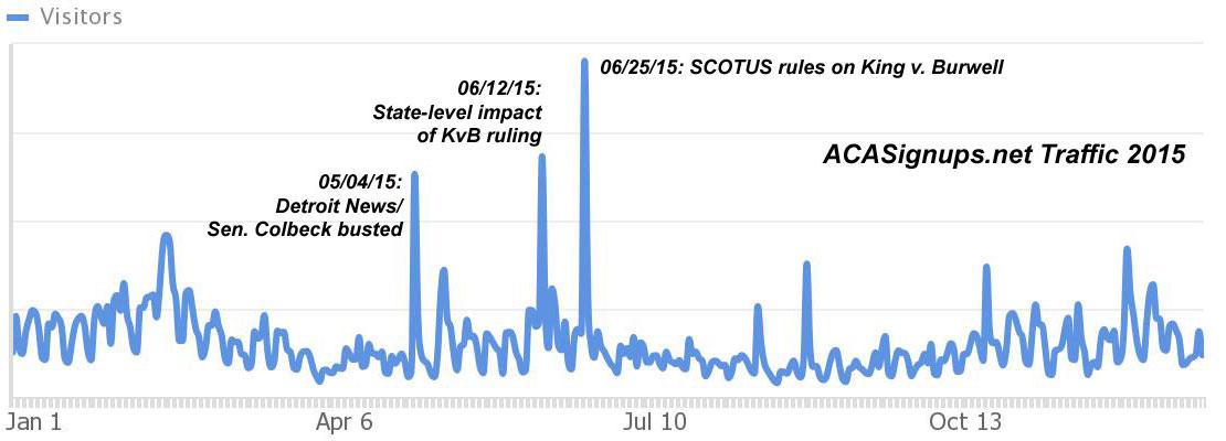 As an aside, here are similar charts for 2014 and 2015. As you can see, there were fewer significant spikes in the prior years, although nothing can compare to the big one on March 31, 2014 (the official deadline of the very first Open Enrollment Period, although they also tacked on a 2-week "overtime" period to handle the overflow traffic). I've yet to surpass that record and likely never will (the day of the Supreme Court's King v. Burwell ruling came close).