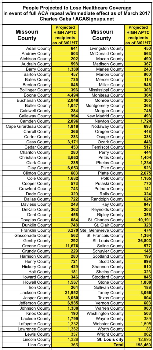 In the case of Missouri, assuming 283,000 people enroll in exchange policies by the end of January, I estimate around 198,000 of them would be forced off of their policy upon an immediate-effect full ACA repeal.