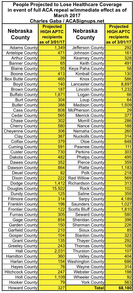 In the case of Nebraska, assuming 96,000 people enroll in exchange policies by the end of January, I estimate around 68,000 of them would be forced off of their policy upon an immediate-effect full ACA repeal.