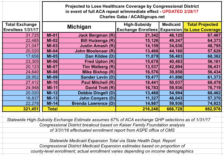 • For instance, Oakland County, Michigan has 53,868 people enrolled in ACA Medicaid Expansion. Oakland County is sliced into 4 separate CDs (MI-08, 09, 11 and 14), so I add 13,467 people into each of those Districts.