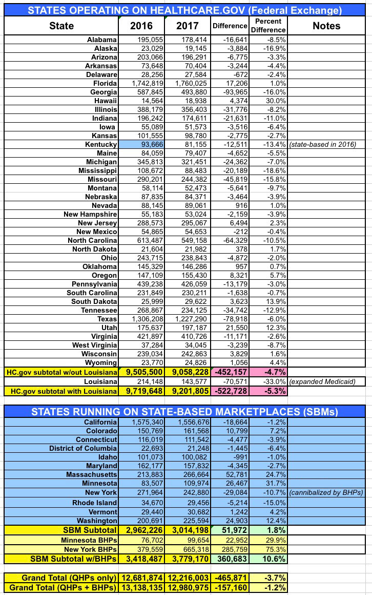 UPDATE: Oh, since I spent so much time noting the impact of Trump's "Final Week Ad-Kill" on the final HealthCare.Gov enrollment numbers, I should also update this table, which compares the HC.gov states to the state-based exchange states. It's not quite as dramatic a difference, but there's still a huge disconnect between the two. Again, HC.gov states saw a net drop of either 4.7% or 5.3% (depending on whether you include Louisiana or not, since they expanded Medicaid mid-year)...while enrollment across the 12 state-based exchanges increased by 1.8% year over year. Furthermore, if you include the BHP programs in Minnesota and New York, the SBMs actually saw a whopping 10.6% increase in enrollment year over year!