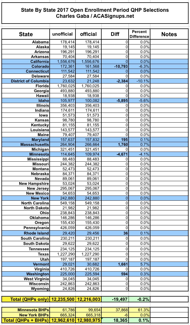 The "missing" enrollments are from Colorado, Idaho, Minnesota and DC, partly cancelled out by higher numbers from Massachusetts and Vermont, with nominal extras from Maryland, Washington State and Rhode Island. The Minnesota discrepancy is because MNsure tacked on an extra week for their SEP; it looks like those enrollments weren't included in the official total. In Idaho's case, I suspect that the 5,900 difference is made up of standalone dental plans (they didn't separate those out in an earlier report). Vermont and Washington are simply due to neither state having released hard numbers earlier.