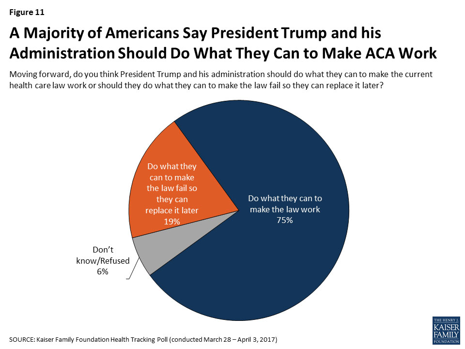 Despite the divided views towards the law, three-fourths of the public think President Trump and his administration should do what they can to make the current health care law work while one-fifth (19 percent) of Americans say President Trump and his administration should do what they can to make the ACA fail so they can replace it later.