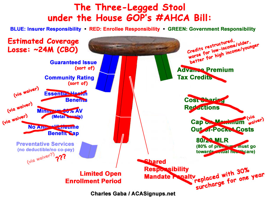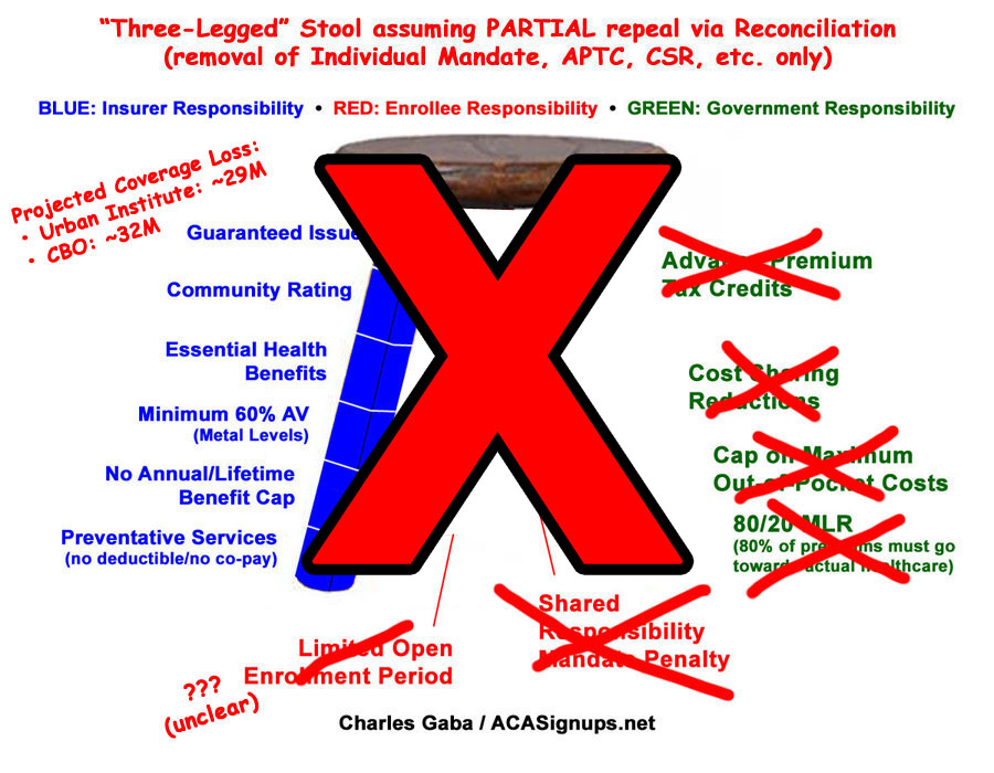 Here's what it actually looks like for a variety of reasons, including both legitimate glitches in the ACA itself as well as a whole lot of flat-out sabotage by the GOP over the past 7 years. While there are plenty of other issues which need to be addressed, the most obvious ones are that the tax credits need to be beefed up and applied to enrollees over the 400% FPL threshold, and the mandate penalty should really be increased. In short, two legs of the stool need to be lengthened...to continue the metaphor, we need a couple of shims. Around $12 billion per year or so should do the trick on the tax credit side. As it happens, one of the few useful parts of most of the GOP plans is that they do include a good $120 billion or so in "reinsurance/stabilization" funding over 10 years...which, in practice, would amount to about the same thing. The key is that this funding would have to be added to the existing ACA funding, not replacing it, which is what these plans do instead: