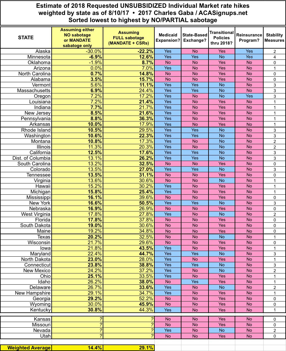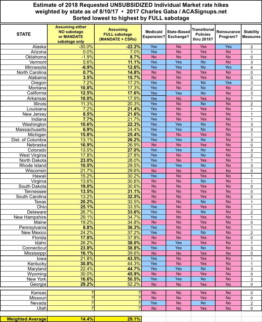 This year, I'll still have to plug the numbers in to get the weighted averages (which is made even more complicated by the CSR sabotage factor), but it looks like any patterns will be harder to parse out. Here's what the states look like from lowest to highest using the "No/Partial" sabotage or "FULL" sabotage numbers, with Medicaid Expansion, State Exchanges, Transitional Policies and Reinsurance Programs. The only obvious pattern so far is that yes, a reinsurance program does make a huge difference in cutting down average premiums: