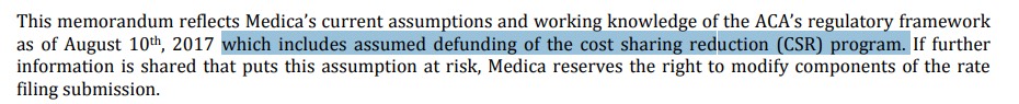 As for the "Trump Tax", the Medica filing is calls out both "market morbidity" and "unprecedented uncertainty/risk in the market" as being major contributors, and the PDF version specifically says that it "assumes defunding of the CSR program", so that 29% hike appears to refer to the full Trump Tax factor: