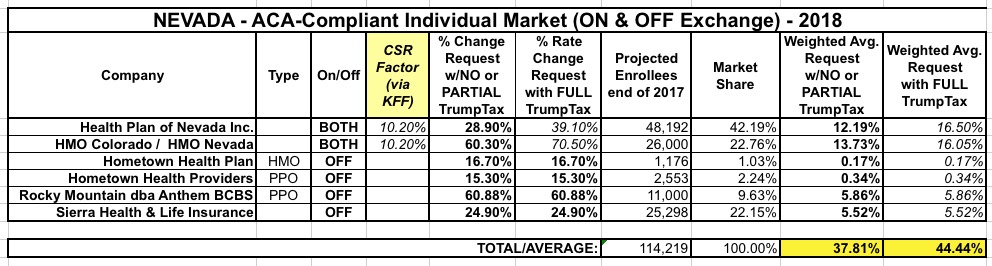 Nevada is the final state to post their requested rate hikes for 2018 (or at least they're the last one I tracked down, anyway). I've now done at least a rough analysis of all 50 states + DC, and while some of the data is a bit outdated (remember, I started doing this back in late April/early May), most of it should still be fairly close to the present situation...at least in terms of requested rate hikes.